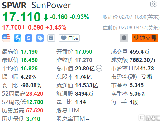 格隆汇2月8日丨SunPower(SPWR.US)盘前涨3.45%,报17.7美元。资料显示,该股在2月5日获公司高管Kuzak Derek净买入1.47万股。