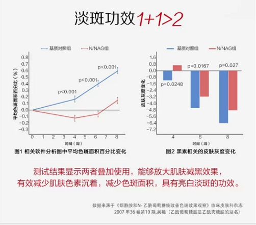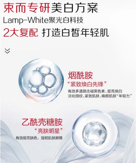 该系列采用Lamp-White聚光白科技(烟酰胺+乙酰壳糖胺),基于皮肤黑色素形成过程的机理而科学设计,两者叠加能够放大肌肤减黑效果,对皮肤还有一定的修复效果,达到1+1>2 的美白效果。