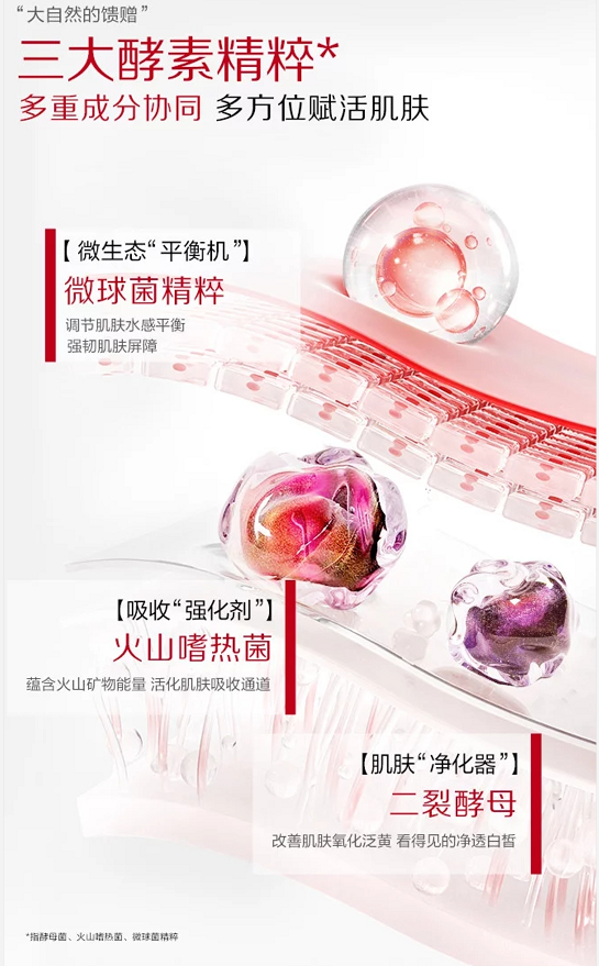 同时复配三大酵素精粹,二裂酵母精粹修护肌肤氧化泛黄,火山嗜热菌精粹蕴含火山矿物能量,活化肌肤吸收通道、微球菌精粹调节肌肤微生态水感平衡,强韧肌肤自身修护力,多种机制保护肌肤免受色斑暗沉的困扰,减少由于氧化引起的泛黄和斑点,让肌肤更加健康白皙。